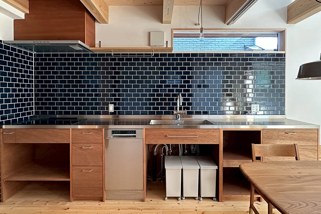 また、キッチンの壁面にはタイルを使用しデザインと使い勝手を両立させています。さらに、「シンク下に収めるワゴン」と「ダイニング側のステンレス天板の作業台」も使い勝手を考えてオリジナルで製作。こだわりにあふれたオリジナルの空間は必見です。