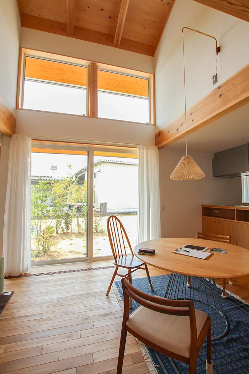 この家の中心にあるダイニングは吹き抜けになっていて、2階の窓から光が心地よく降り注ぐ気持ちのいい空間。